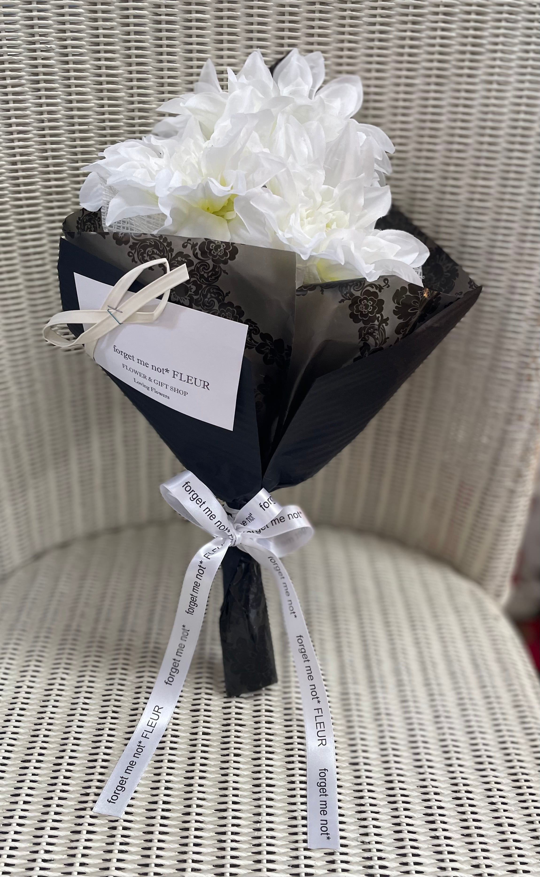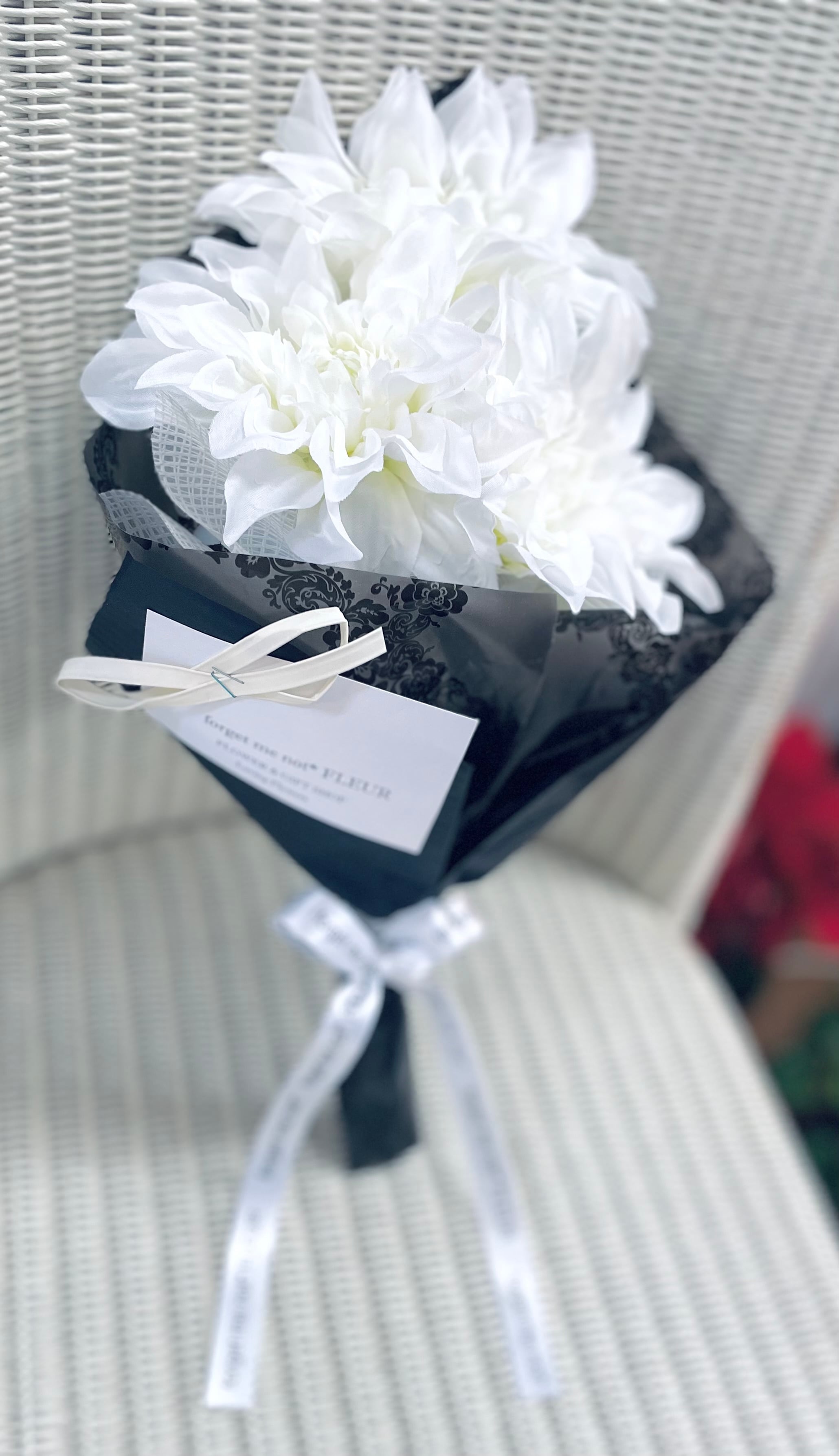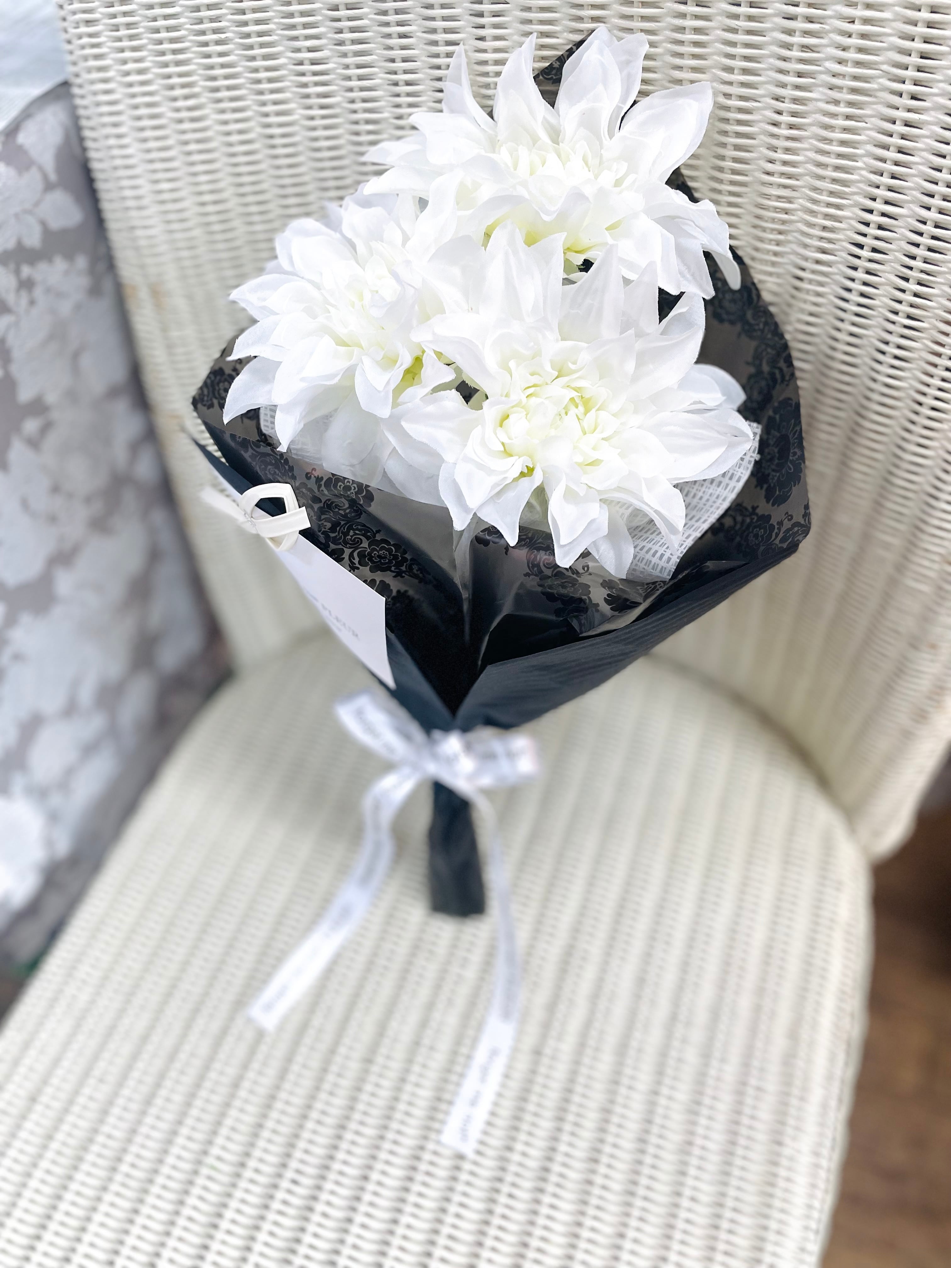 ホワイトダリアの花束 ブラックラッピング