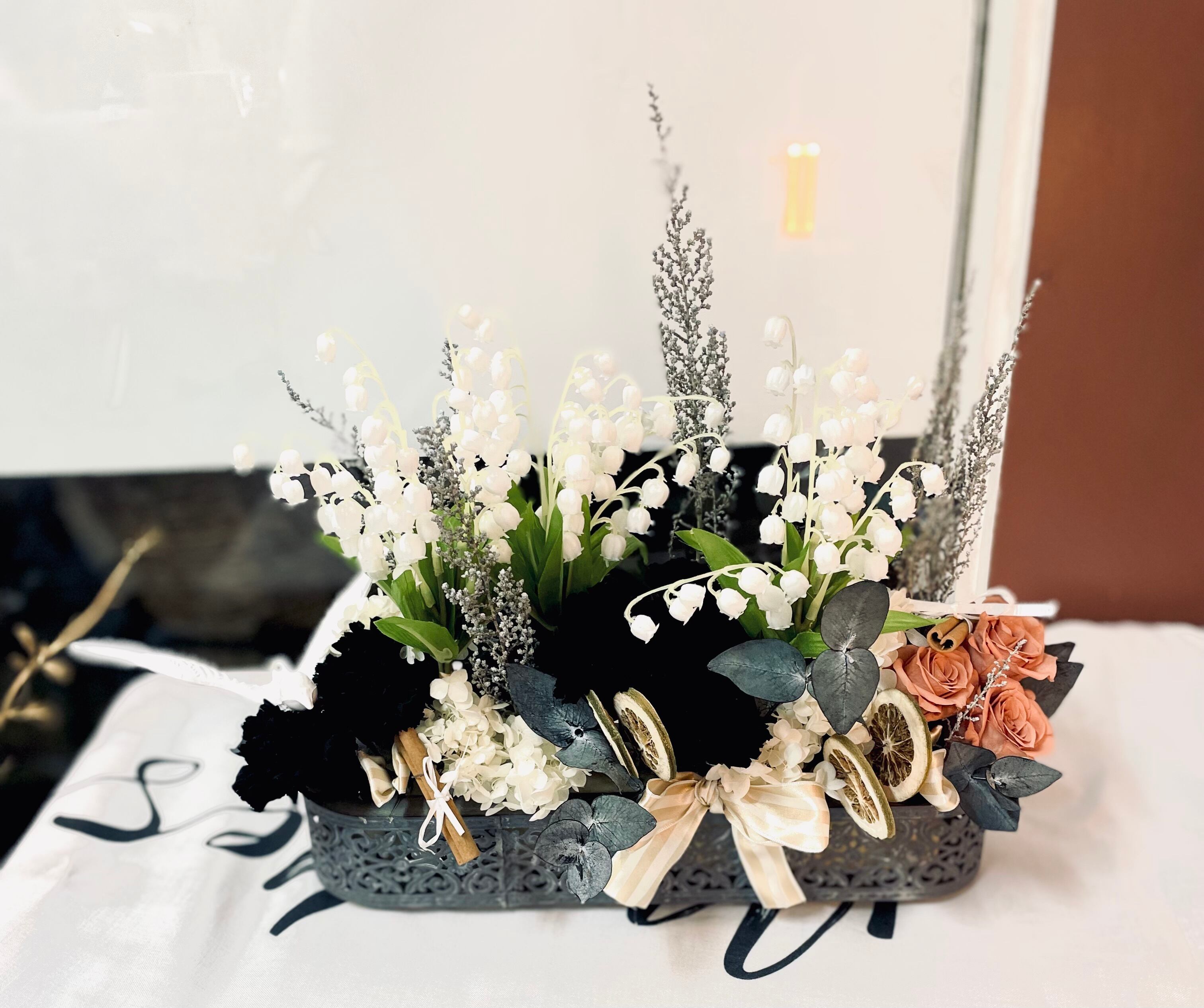 スズランとブラックカーネーション白い鳥は、優雅なスズランと神秘的なブラックカーネーションが調和した、美しさにあふれるデザインのアイテムです!その特別な組み合わせが、受け取った方に深い感動をもたらし、心を温める瞬間を提供します。